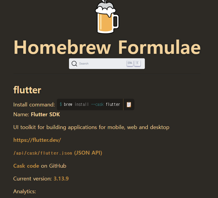 homebrew 상단에 flutter를 검색해보면 오늘 기준으로는 이런 화면이 나옵니다.