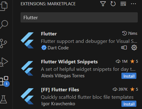 설치 후에는 vs code를 실행하고 extensions tab에서 flutter가 install되어있지 않다면 설치하도록하자. 아까는 sdk를 설치한거고 지금은 flutter 개발을 vs code로 편리하게 할 수 있도록하는 것을 설치하는 것이다..